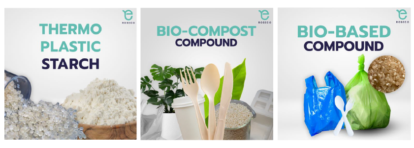 Our ROSECO line of biodegradable products promotes sustainable, zero-waste solutions for a better world. These responsible solutions are "from nature, for nature." The ROSECO series includes Thermoplastic Starch, Bio-compost Compound, and Bio-based Compound, which can be used in various applications such as bags, trays, mulch films, and consumer goods.